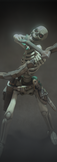 A skeletal warrior appears as a cracked and yellowing skeleton covered with shards of decaying flesh. Its eyes are black holes containing pinpoints of reddish light. It is clad in the blackened armor and rotted trappings it wore in its former life.