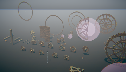 - Large, traversable gears and cogs of all shapes and sizes - hanging horizontally and vertically
