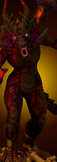 Glabrezu are towering, broad and well-muscled, with four arms, two that end in clawed hands and two with powerful pincers. They have dog-like heads with sharp fangs and penetrating violet eyes. Their skin color ranges from a deep russet to pitch black. These commanding tanar’ri are terrifying to see.
